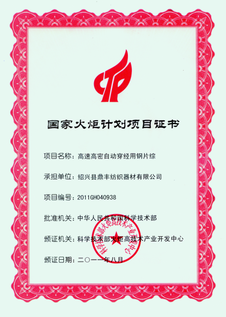 浙江鼎丰纺织器材有限公司始建于1986年,是一家专业生产各类无梭织机用钢筘:喷气筘、喷水筘、剑杆筘、其他类型钢筘;铝合金综框、钢片综、停经片、经轴、织轴、卷布辊等产品及配件的民营企业。